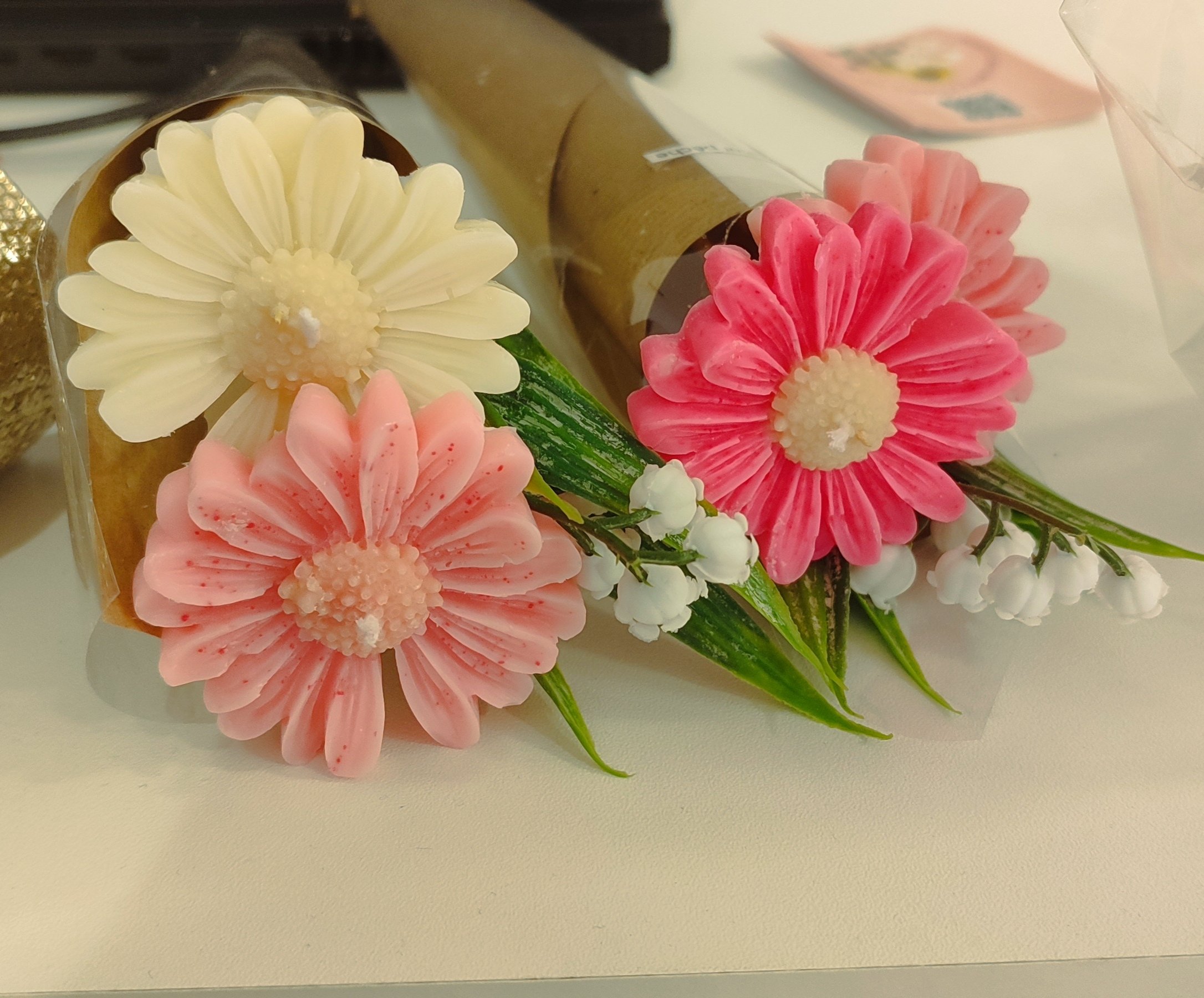 Bouquet de fleurs en bougies parfumées avec un brun de muguet artificiel