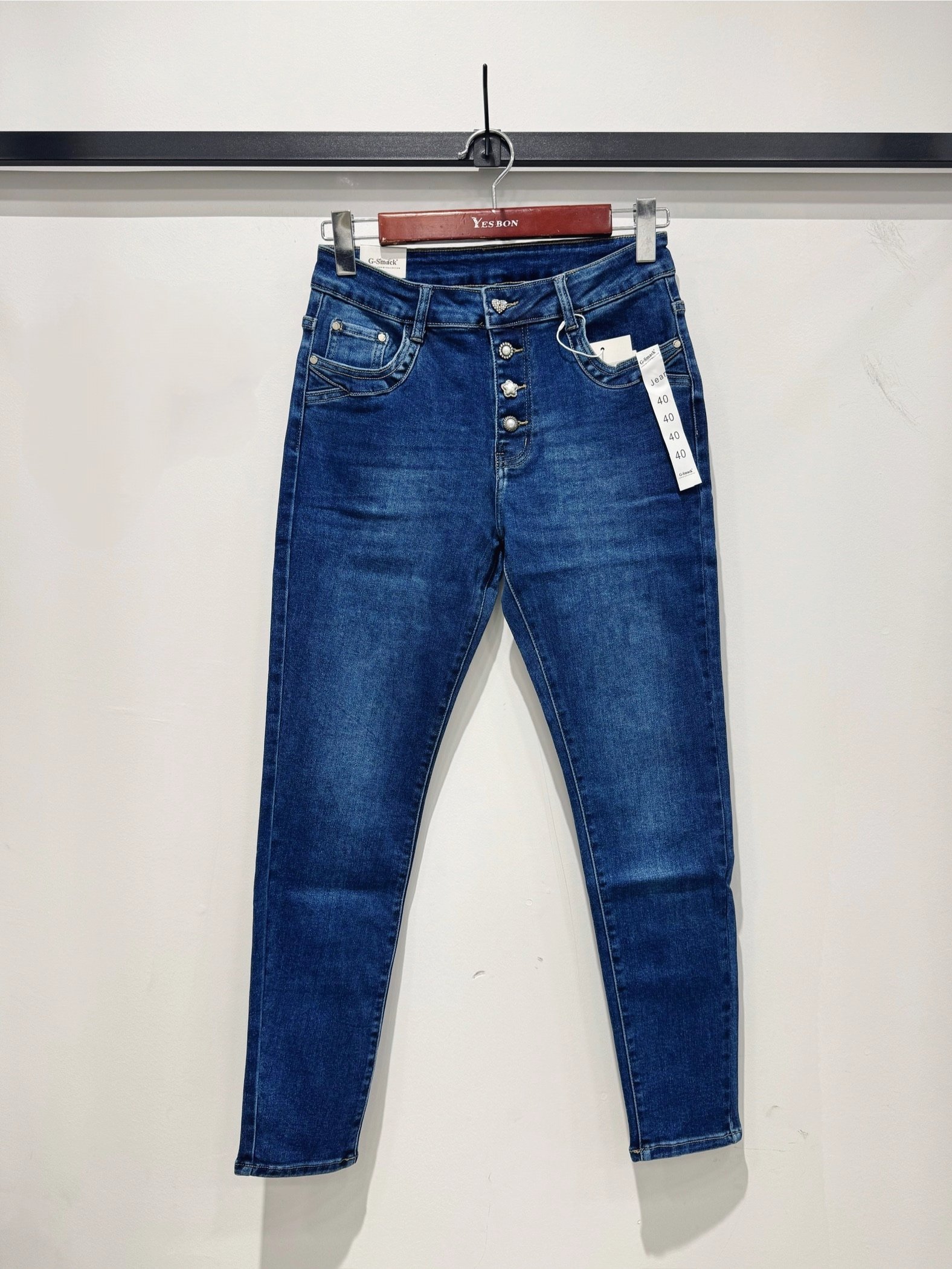 Jeans grande taille boutons argentés et strass décoratifs bleu stretch