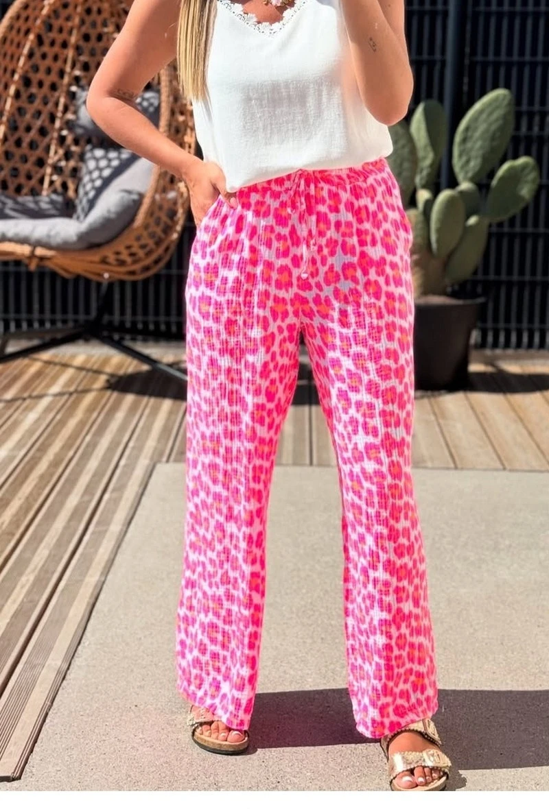 Pantalon gaze de coton léopard rose fluo orange