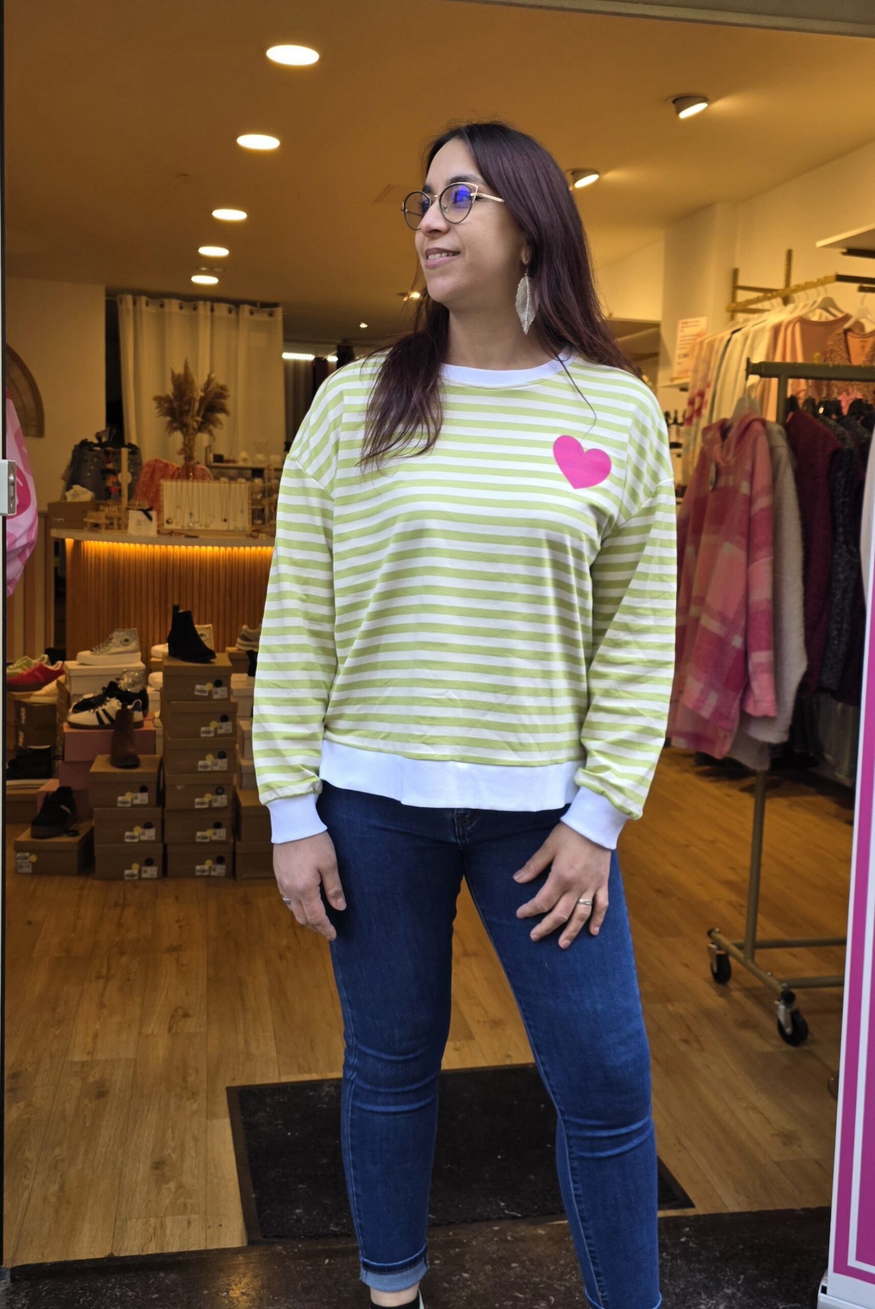 Pull fin April Vintage rayé vert coeur