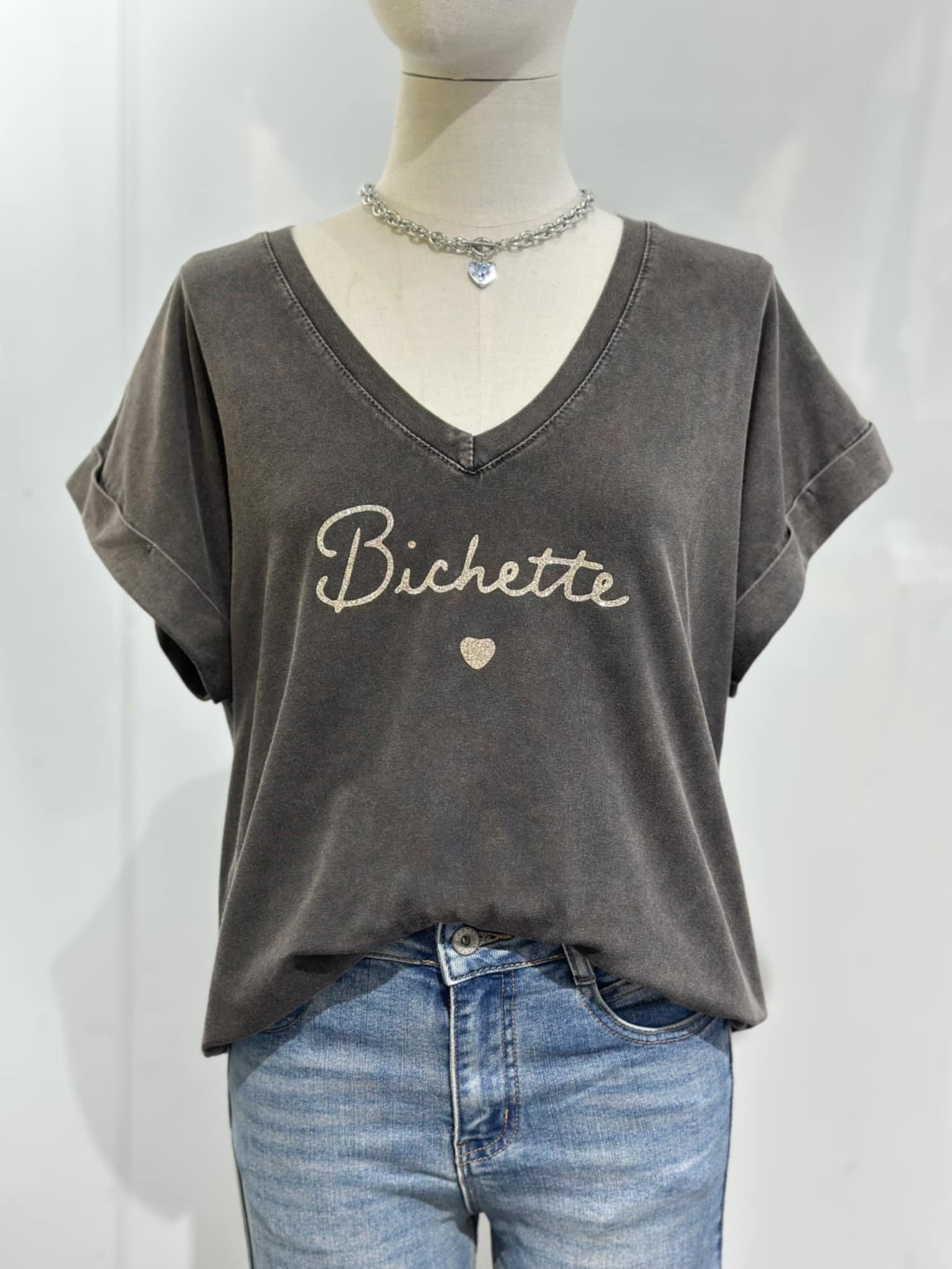 Tee-shirt April Vintage col V bichette gris délavé pailleté blanc