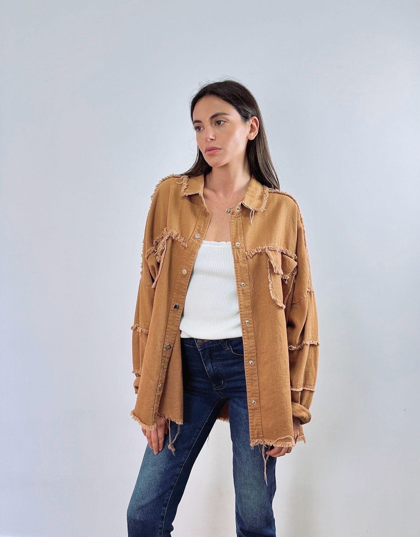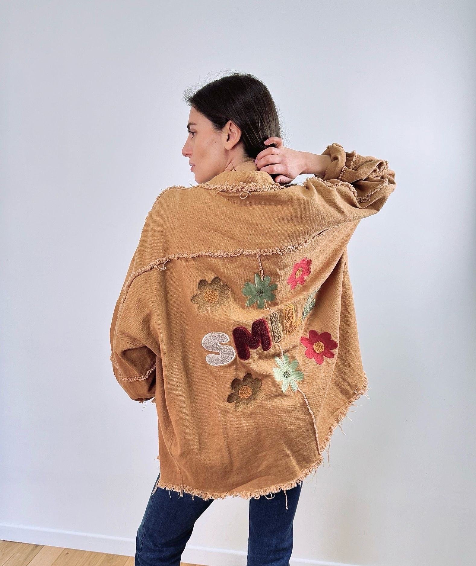 Veste destroy camel fleurs multicolores smile oversize